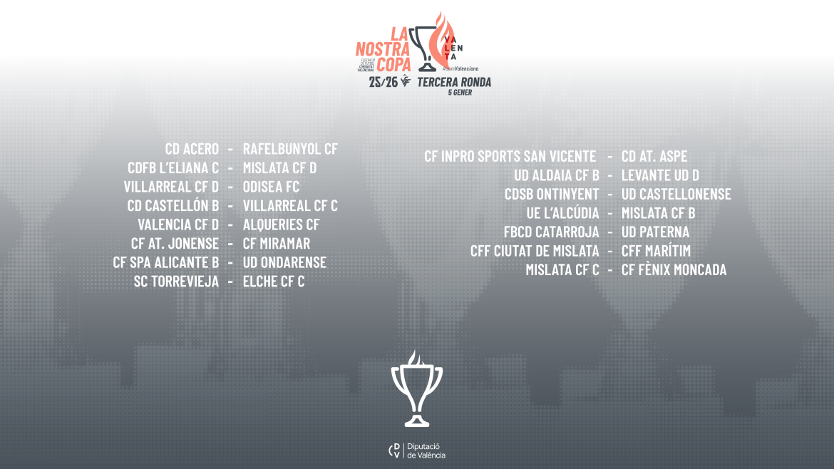 La FFCV ha hecho públicos los emparejamientos de la tercera ronda de la cuarta edición de La Nostra Copa Valenta de fútbol. En esta eliminatoria participarán 30 equipos, ya que participan los 20 equipos clasificados de la anterior, además de los 10 equipos exentos de Lliga Autonómica Valenta. Los partidos se disputarán durante el lunes 5 de enero de 2026.