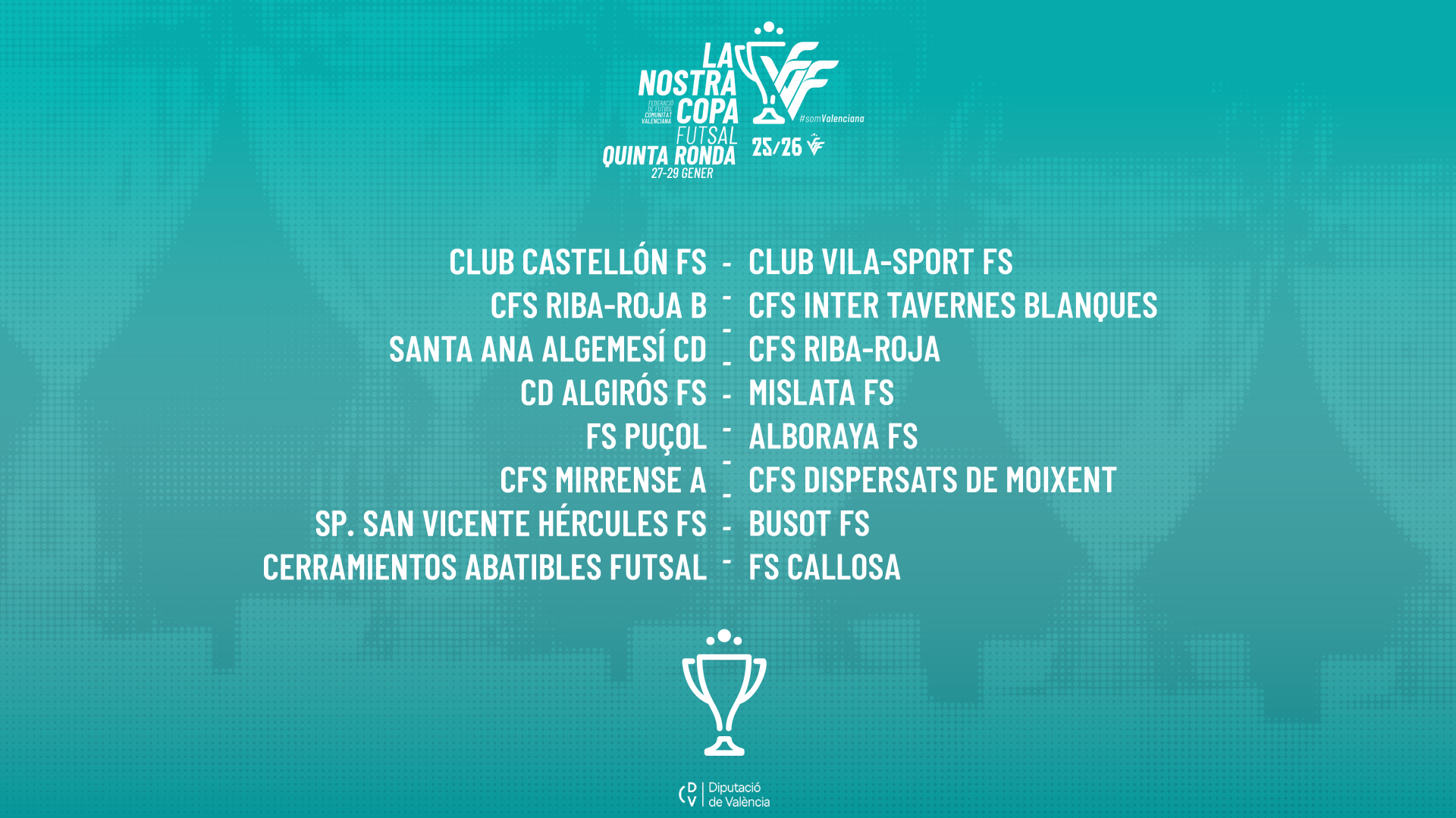 El Comité Tècnic de Futbol Sala de la Federació de Futbol de la Comunitat Valenciana ha confirmado de manera oficial los emparejamientos de la quinta eliminatoria de ‘La Nostra Copa’ en modalidad masculina.