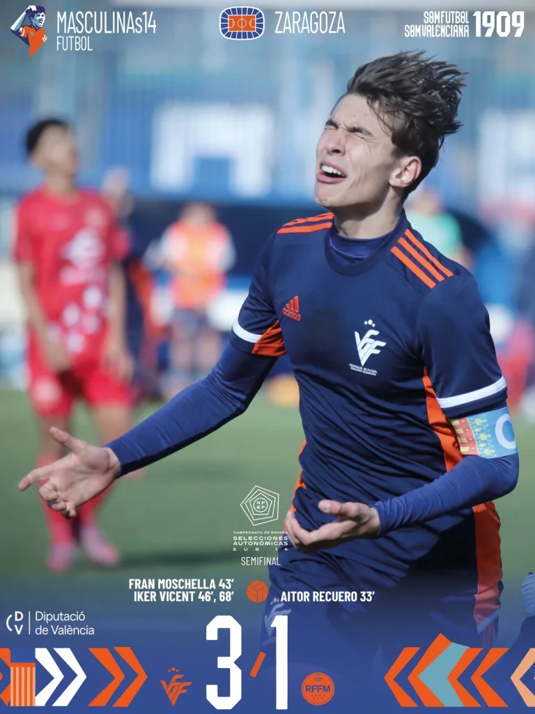 La Selecció Valenciana masculina sub14 de fútbol remontó una semifinal que estaba muy cuesta arriba ante la Comunidad de Madrid y se clasificó para la gran final del Campeonato de España (3-1).