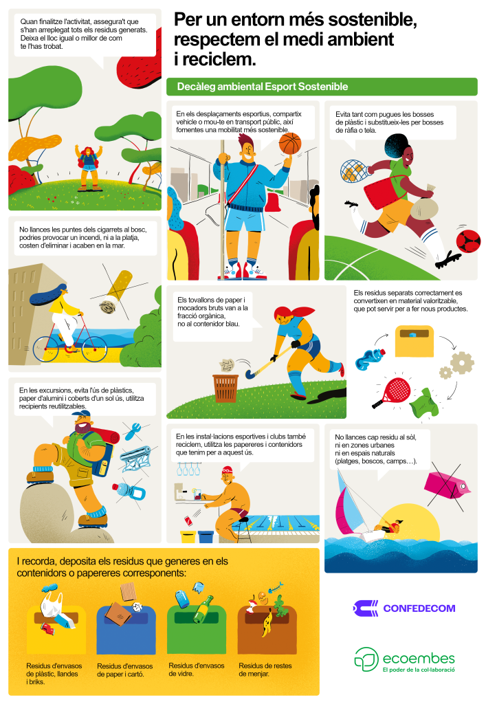 En este marc, Ecoembes subministra a Confedecom i a les federacions adherides al programa papereres grogues per a envasos de plàstic, metall i bric, i blaves per a paper i cartró, per a la seua distribució entre les seues seus i instal·lacions esportives.